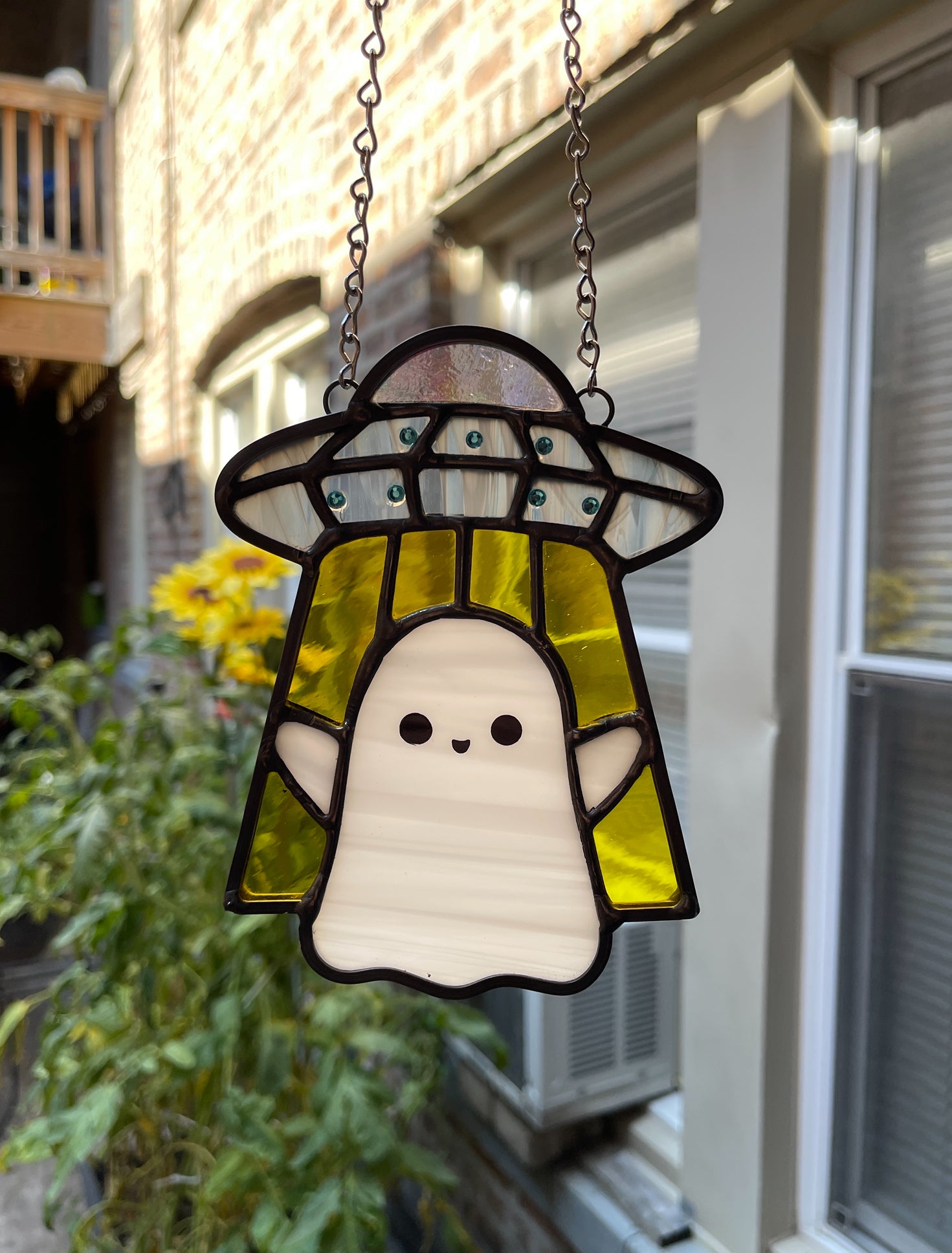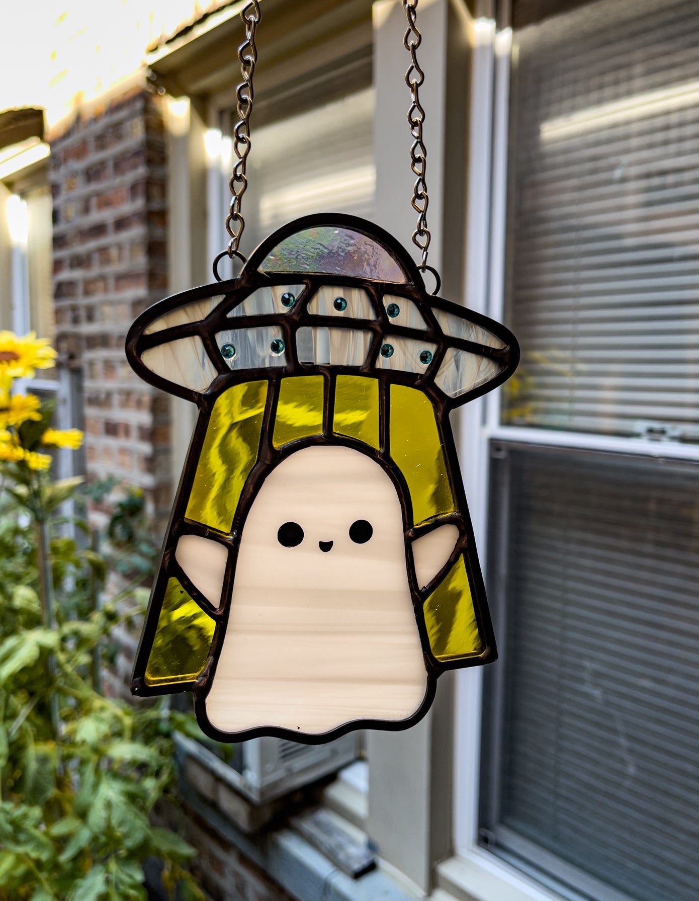 This is a cute and quirky addition to your home decor! This adorable stained glass piece features a charming ufo and ghost design that is sure to bring some playful fun to any room.